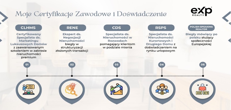 Monika posiada prestiżowe certyfikaty: Certified Luxury Home Marketing Specialist (CLHMS), Real Estate Negotiation Expert (RENE), Real Estate Divorce Specialist (REDS) oraz Resort & Second-Home Property Specialist (RSPS). Specjalizuje się zarówno w nieruchomościach tradycyjnych, jak i luksusowych w Illinois i na Florydzie.